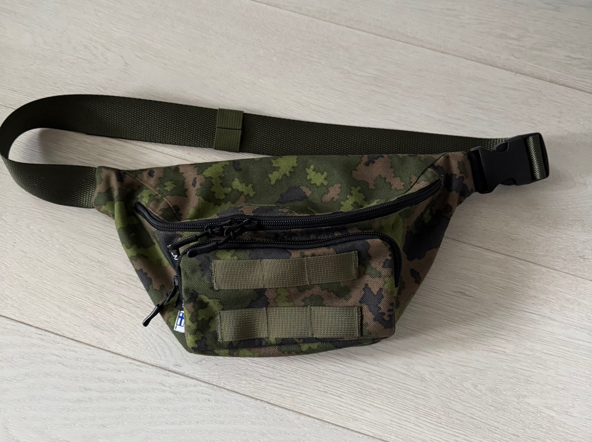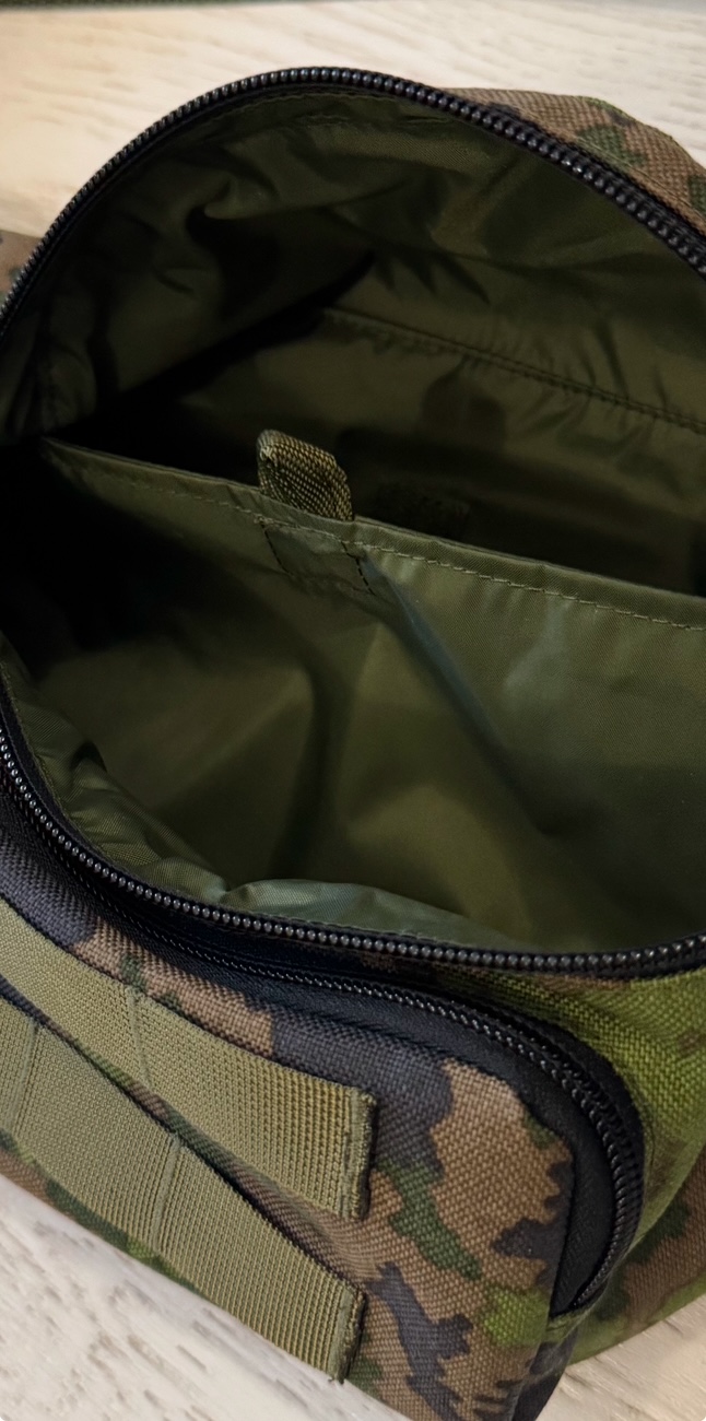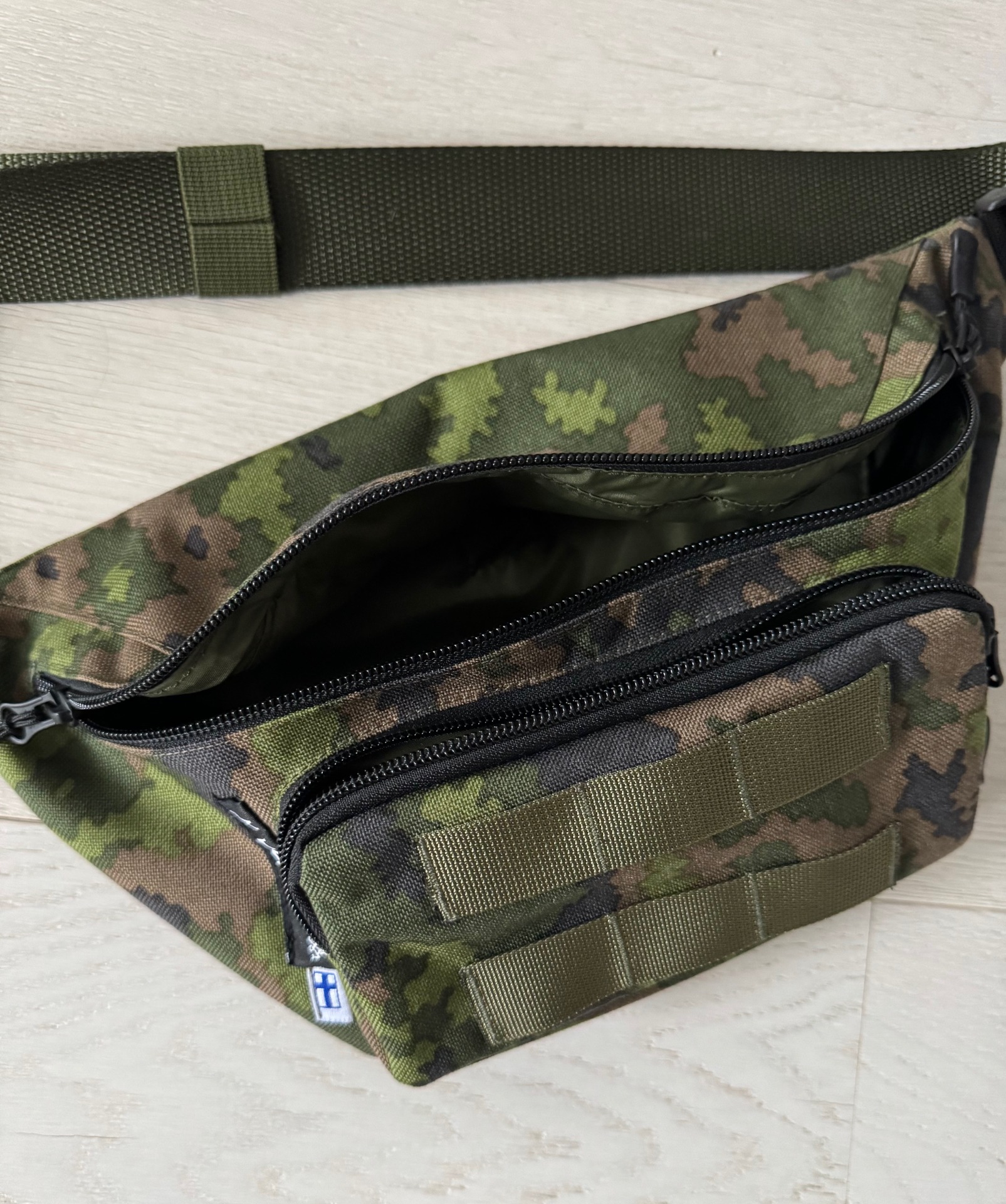 Valmistettu yhteistyössä Porvoossa vaikuttavan ompelijan kanssa. Käsintehty, kankaat suomalaiselta toimijalta. Vyölaukussa perussetti eli säädettävä lannevyö, kaksi vetoketjullista taskua. Isommassa taskussa erillinen lokero vaikkapa passille tai muille asiakirjoille. Etummaisessa taskussa PALS-kujat. Vahva lukitusmekanismi on vasemmalla sivulla, sopii hyvin oikeakätiselle soturille. Ole erikseen yhteydessä, jos haluat, että lukitus on oikealla puolella. Lannevyön kokonaispituus on n. 140cm eli normikokoinen henkilö voi heittää vyölaukun